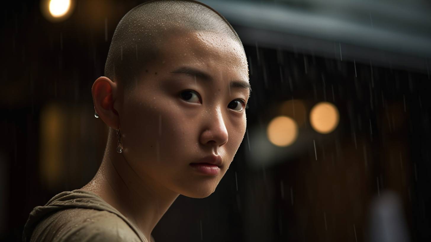 頭やひたいの、雨の滴まで、美しいのが、坊主女性。